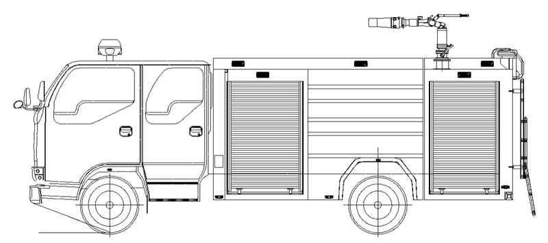 整車由消防員乘員室和車身兩大部分組成,車身布置采用內藏罐式結構,左右兩側為器材箱,中部為水罐,器材箱后部為泵房。 |